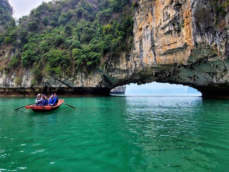 Visit Luon Cave, one of the most beautiful lagoons in Halong Bay, surrounded by towering cliffs and lush vegetation.